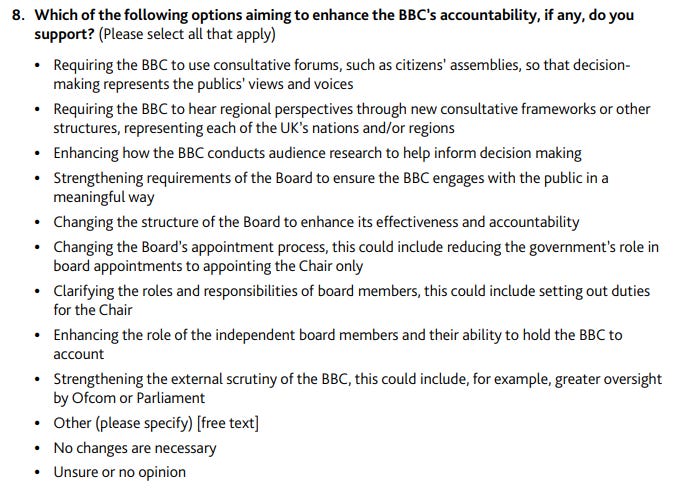 Worse still, some of the most important questions about the BBC’s future are heavily leading in favour of (what appear to be) the Government’s preferred BBC reforms. Question 29 takes the cake:
