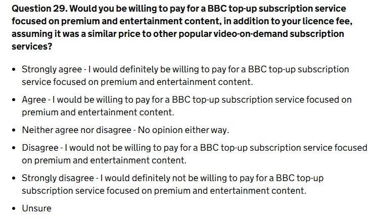 Note that you aren’t being asked whether the BBC should or should not introduce a top-up subscription service, or how it might impact the BBC’s mission to serve all audiences equally. The Government only wants to know if you would pay for it, as a kind of market research on a potential customer base.