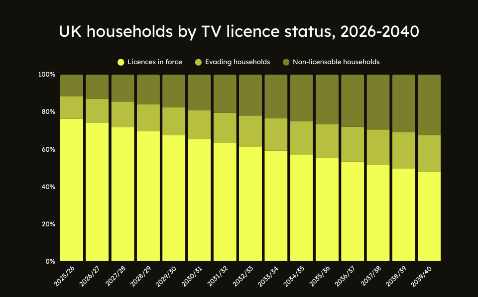 By 2030/31, licence fee evasion could cost the BBC almost £1 billion a year. By 2040, the combination of evaders and non-licensable households could mean that more than 50% of UK households will not be paying the licence fee.
